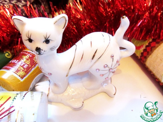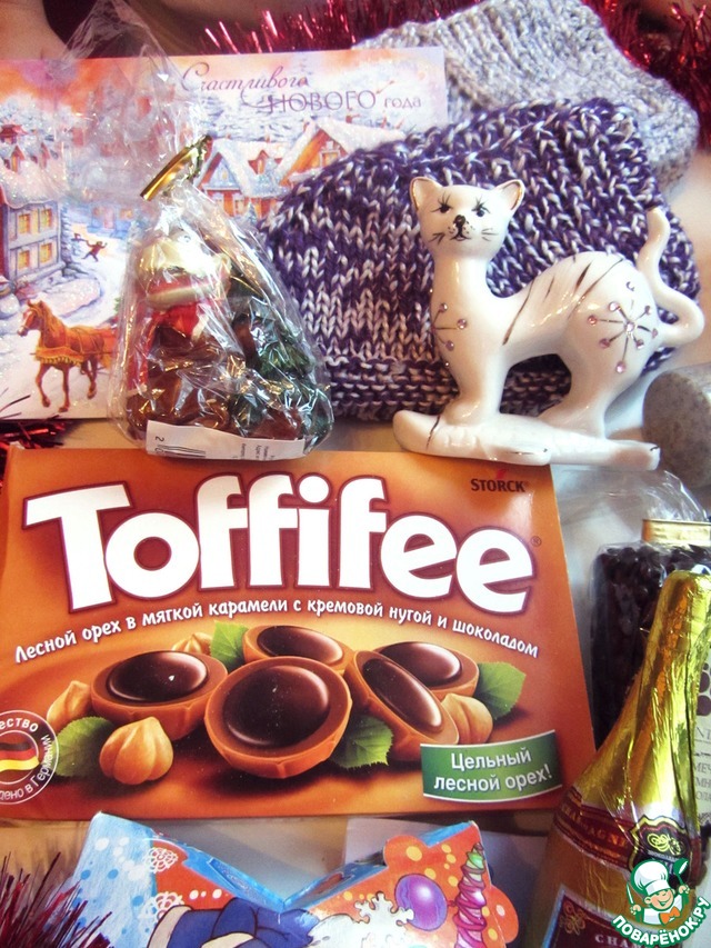 [cut] Замечательная кошечка в мою коллекцию! Такой гламурной кошечки со стразами у меня еще не было! Спасибо большущее! Тапочки Карине очень понравились! Немного великоваты, но это временно)) И "Тоффифи"!!! Мои любимые))) При всём нынешнем изобилии конфет, я люблю только буквально пару марок.. И надо же так угадать)) Юлечка, да ты волшебница! И свечка Обезьнка - символ наступающего года, бутылочка шампанского выглядывает)