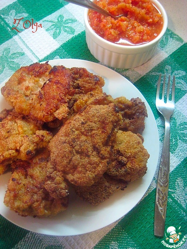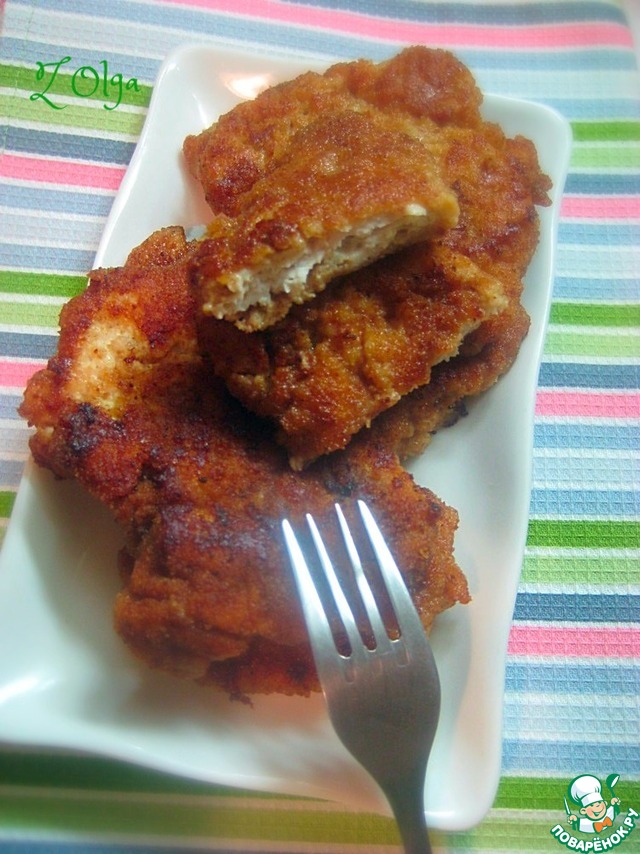 «Мясо в хрустящей корочке» https://www.povarenok.ru/recipes/show/115785/ по рецепту Ларисы лялич. Вкусное получилось! Панировка действительно хрустящая. В аджике и яйце я мясо подержала минут 40, оно чуть промариновалось и напиталось вкусами аджики…очень вкусно!
