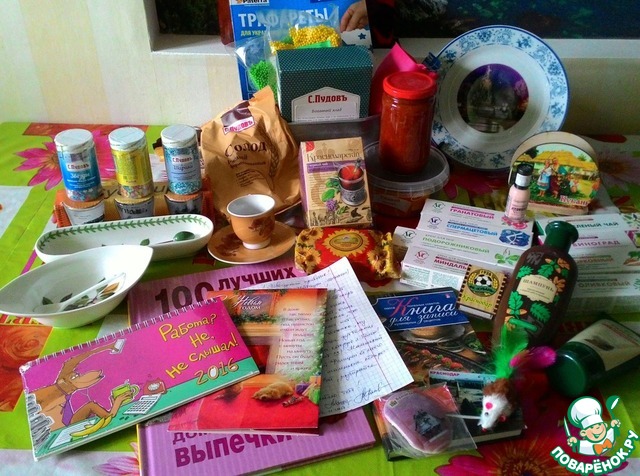 Открыточка с добрыми пожеланиями, календарь со смешнючими обезьянами, книга для записей рецептов(Кстати очень! Моя старенькая закончилась почти), шикарная книга "100 лучших рецептов для выпечки"!