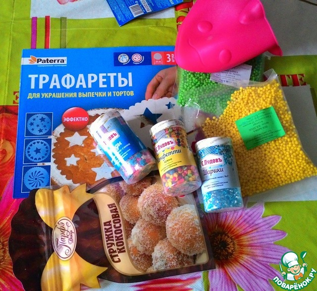 А еще - пять видов кондитерской посыпки для украшения выпечки, кокосовая стружка, силиконовая прихваточка и моя мечта- трафареты для украшения тортов! Машуля точно - Фея!