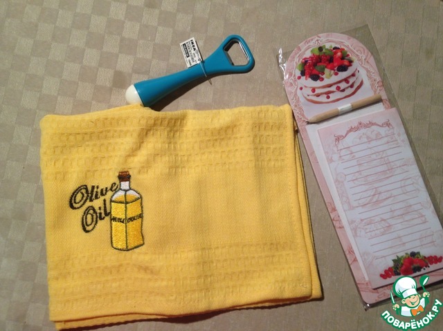 Это яркое полотенечко,красивенный блокнот с карандашом и открывашка красивого голубого цвета!
