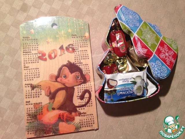 А это очень милая и красивенная досочка с календарём и символом следующего года:обаятельной обезьянкой!И очень красивая коробочка в виде ёлочки с вкуснейшими конфетками