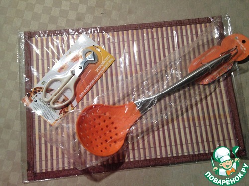 Это яркая шумовка,красивая подставка и очень необычное приспособление:устройство для вскрытия перепелиных яиц (первый раз такое вижу,я в восторге,как это удобно...).
