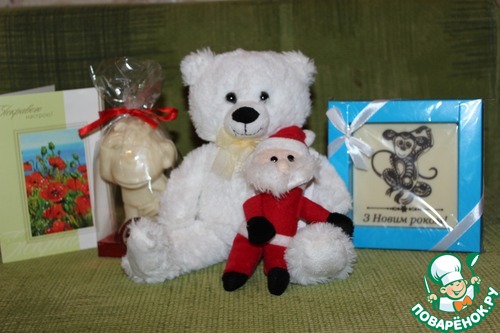 В посылке оказался очаровательный мишка (который был назван дочкой Афанасием и моментально у меня отобран), сувениры и сладости.