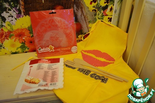 Обалденный фартук, с таким прикольным принтом и ярким солнечным цветом, лопатки, салфеточки для сервировки пирогов и трафареты для украшения выпечки! (У нас я даже не видела трафаретов в продаже, так что для меня это еще и что-то новое, неизведанное!)
