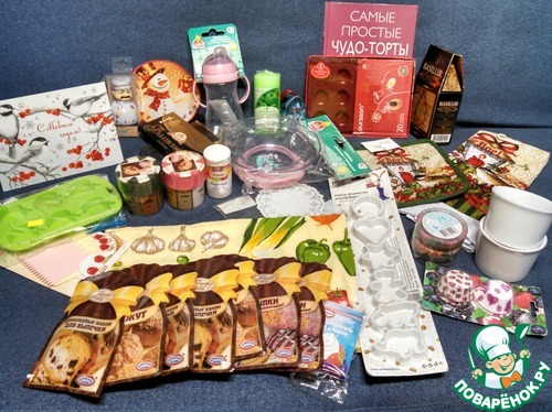 Два кондитерских шпателя, милейшие бумажные формочки для маффинов, две стильные белые керамические формы для запекания и очень симпатичный набор формочек для печенья.