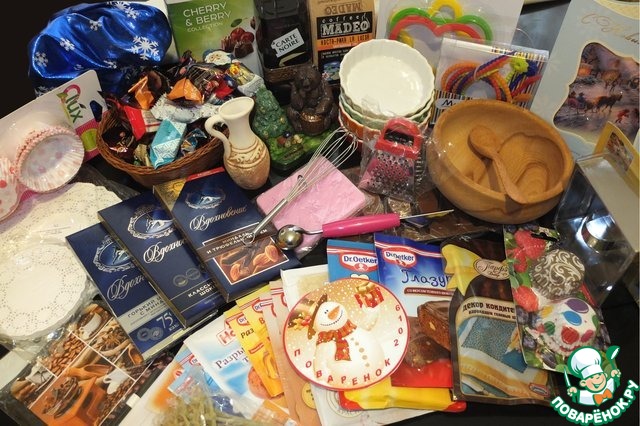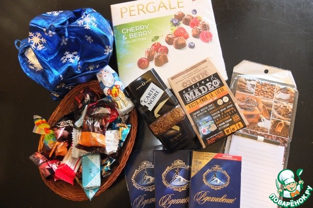 Огромное количество красивых, нужных милых сердцу вещей!! Шоколадно-кофейное изобилие!! Целый мешок вкуснейших конфет, шоколадные конфеты, шоколадки, кофе и милая записная книжечка с магнитиком на холодильник!!!