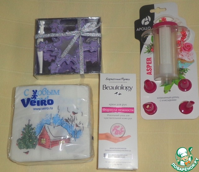 Очень красивая новогодняя свеча, салфеточки, крем для рук. И самое интересное - кулинарный шприц. Мой шприц сломался недавно и я находилась в поиске нового. А тут Наташа подарила мне шприц, не зная о том, что он у меня сломался. И что интересно, этот шприц схож с моим прежним, как я и хотела!