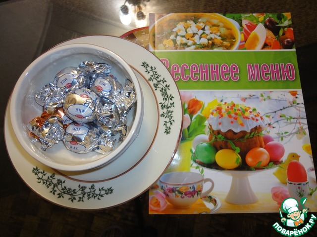 Вот такая замечательная керамическая тарелочка, вазочка с вкусными конфетами, очень красочная книжка с весенними рецептами и шикарными фото к ним!!