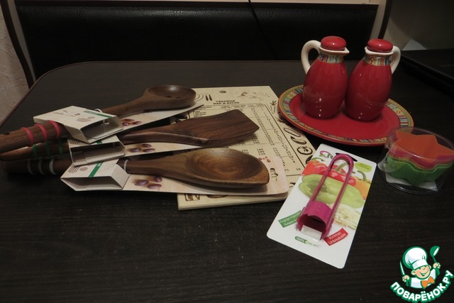 А в каком я была восторге... Обалденные лопаточки-ложечки из акации, десертная тарелочка и набор из двух кувшинчиков для масла и уксуса коллекции "Мехико", разделочная доска с таблицей мер и весов - ну просто незаменимая для меня вещь на кухне, набор силиконовых формочек и прикольное приспособление для подготовки перцев к фаршировке. Такого я еще не видела. Очень хочется поскорее опробовать!