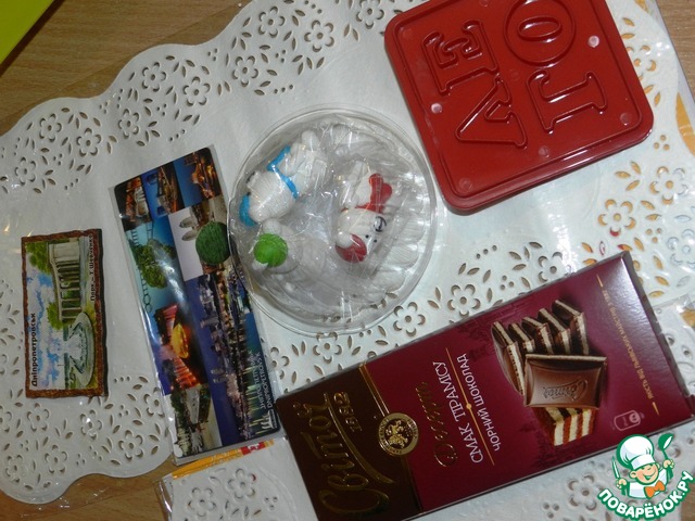 Магнитики с видами Депропетровска (очень красивые, видно, какой большой и красивый город), ажурные салфеточки, шоколадка (мы мечтали об украинском шоколаде!), оттиск для тостов и медведики для украшения тортов