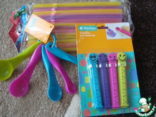 - яркие и удобные штучки (набор мерных ложечек - полезная и нужная вещь в готовке, зажимы для пакетов и набор трубочек)