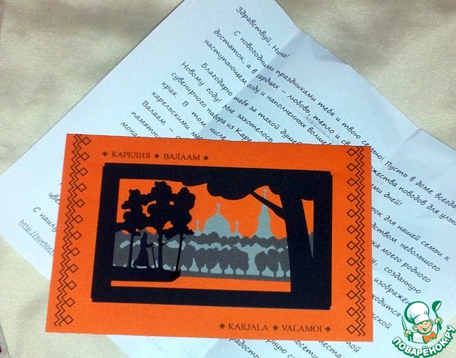 Хитренький Реечка подполз к письму и открыточке почитать, притворившись спящим. Вот хитрюга. Письмо с Новогодними добрыми пожеланиями и эксклюзивная открыточка, созданная местными мастерами, умельцами с видом мужского монастыря на острове Валаам среди Ладожского озера.