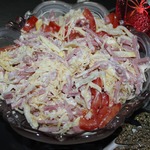 Ингредиенты: Ветчина, Яйцо куриное, Помидор, Сыр твердый, Майонез, Чеснок, Масло растительное.