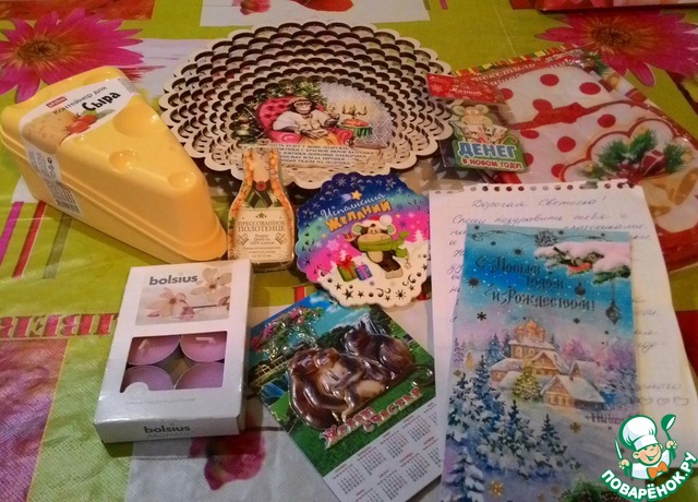Замечательное блюдо из дерева, с Обезьянкой и пожеланиями, яркий фартук и прихватки в красный горошек(классно сочетается с красными акцентами на моей кухне!). Прессованное полотенчико в виде бутылочки, магниты и подставка с Обезьянками, контейнер для сыра и ароматные свечи!