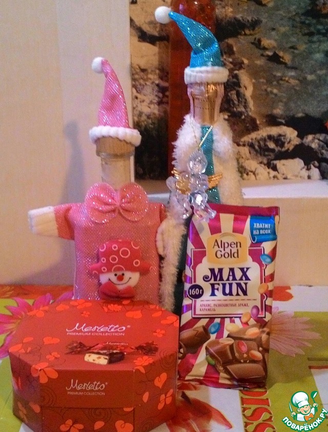 Обалденные наряды для бутылок на новогодний стол! Ольчик, коньяк и шампанское для встречи Старого Нового года одеты и ждут своего часа! Шоколадку сын уже похитил! Конфетки - ооочень вкусные, уже сняли пробу!