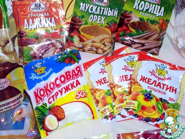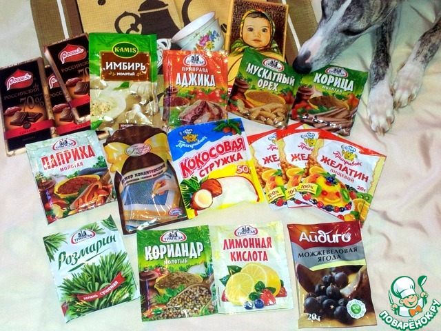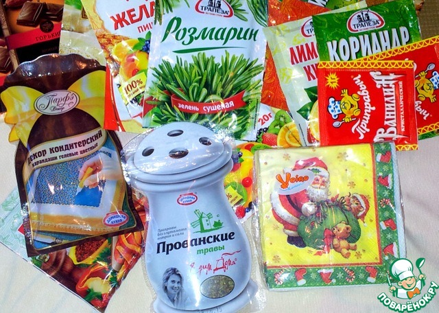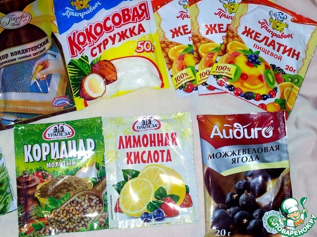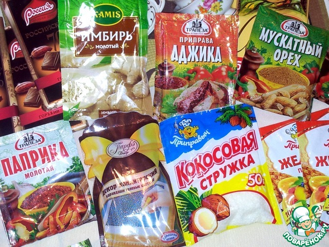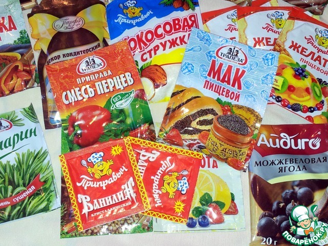 Пакетиков много, на фото все они видны. Приправки, травки, ванилин...