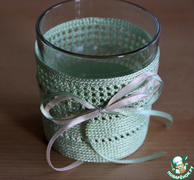 Вначале я достала вот такой чудесный стаканчик, обвязаный нежно-бирюзовыми нитками: