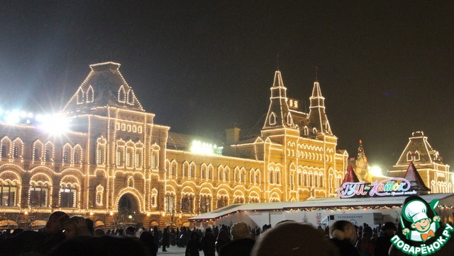Вечером на улице был мороз -20 градусов, поэтому фотографировала я мало, о чем потом пожалела. Вдоль здания ГУМа все липы были украшены красными и золотыми шарами, мне так понравилось это зрелище и эта идея, что я взяла фото из интернета, чтобы поделится с вами этой красотой.