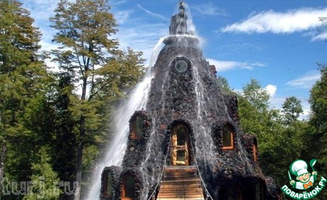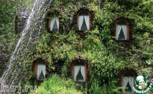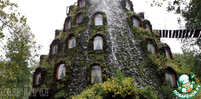 С крыши отеля-горы по стенам бурным потоком стекает вода, словно лава, вытекающая из кратера вулкана. Вот только эта «лава» не уничтожает все живое, а наоборот – дарит живительную влагу вьющимся растениям, которыми густо увиты внешние стены Magic Mountain Lodge. А попасть в чудо-отель можно пройдя по подвесному мостику, который пробирается сквозь густые заросли.