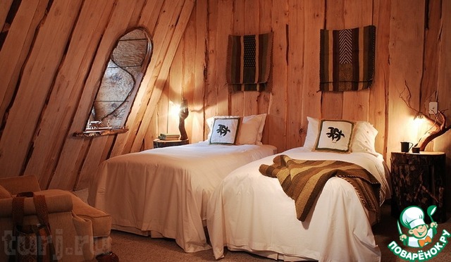 Каждая комната имеет свое название – по названиям местных птиц. В каждой есть своя ванная комната. Но главная достопримечательность отеля, помимо его экзотического внешнего вида, — это горячие бадьи, сделанные из огромных стволов деревьев. Они наполнены горячей водой и установлены на специальные платформы, маня всех гостей отеля и обещая им полную релаксацию и райское блаженство!