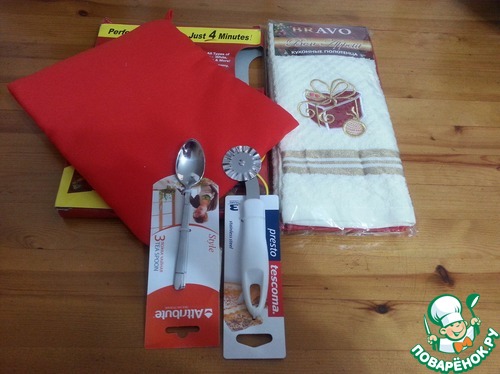Еще я получила очень интересную вещицу- мешочек для запекания картофеля( и не только) в микро. Раньше только видела и читала о таком, а теперь и у меня есть такое чудо благодаря Ирочке. Чудесные кухонные полотенчики с новогодней символикой, Чайные ложечки очень нежные. Я никогда об этом не говорила, но мне очень нравятся чайные ложечки с тонкими ручками, Ириша мне именно такие и подарила. И резное колесико для резки теста и пирогов.