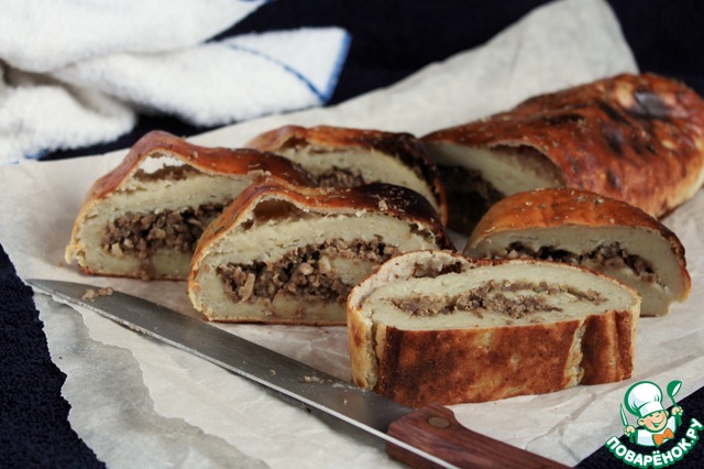 Картофельный рулет с колбасой по рецепту Галины felix032. Вместо колбасы обжаренный с луком фарш, а сверху смазала яйцом. Сворачивала на пищевой пленке. Вкусный и очень сытный рулетик получился!