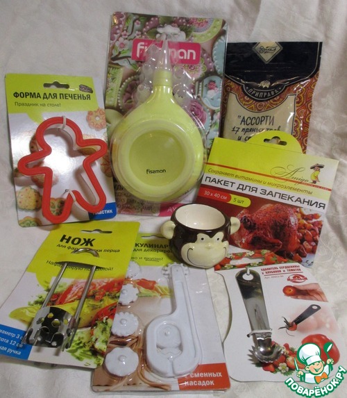 Вот Тут и форма для пряничного человечка,и штукенция с насадками для украшения кремом,и выколупывательница плодоножек у перца....и так же выколупывательница плодоножек у клубники и помидор))) и смешная подставочка под яйцо,в виде обезьянки)я сначала никак не могла понять что это,пока не догадалась прочитать на обороте)а то думал а подсвечник))ещё пакетики для запекания и ножи для фигурной вырезки теста))супер!