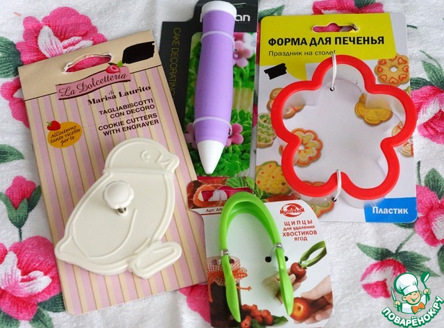 Формочка для печенья цветок, штамп для печенья в виде цыпленка (ух на Пасху развернусь!), щипчики для удаления хвостиков у клубники, шприц для декора кондитерки