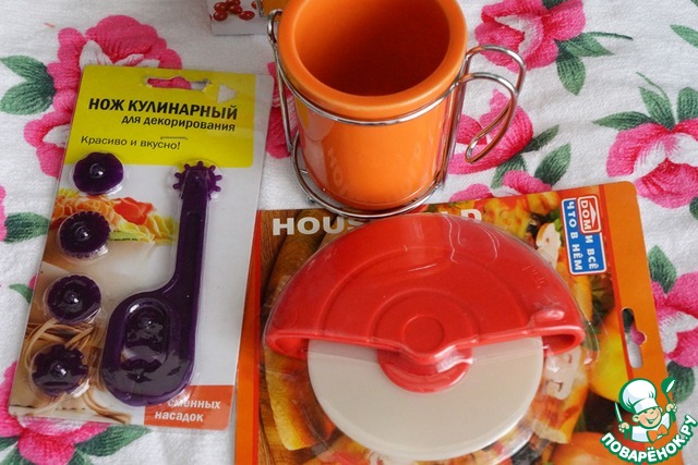 Еще целая куча кулинарных приспособ: нож для пиццы, яркий стаканчик, (написано что для силиконовых лопаток, но я то знаю куда его приспособить получше), нож для декорирования с разными насадками (супер!)