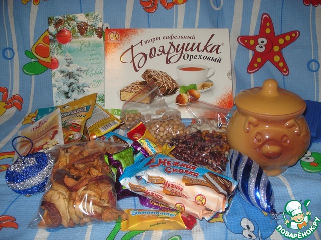 Белгородский мед (я не любительница меда, но этот... Такой янтарный, тягучий, м-м-м!), сухофрукты (яблоки, грушки целенькие, вишенка), сделанные Ниной собственноручно. Компот варю и Нину вспоминаю! Приправа из Казахстана, вкус очень интересный. Ну и Лялька сюда же поставила шоколадные матрешки, очень, кстати, вкусные