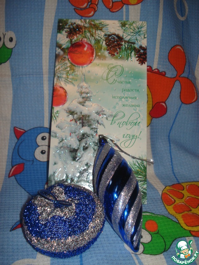 И, конечно же, открытка с теплыми словами поздравления с Новым годом и вот такие игрушки на елочку. Сначала Лялька увлеклась сосулькой, а потом не выпускала из рук шар. Потому что шар мягкий и она решила, что это такая мочалка, она с ней собиралась купаться идти, с трудом уговорили, что это елочная игрушка