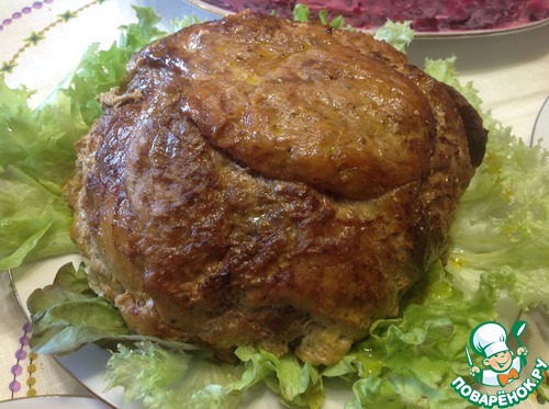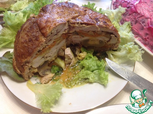 Интересное блюдо!!! На праздничном столе смотрится шикарно!!!! Вкусно!!! В следующий раз мясо замариную на ночь. Куриную грудку меленько порежу и прослою. А шампиньенчиков с сырком сделаю в два слоя. Боялась, что не получиться формовка. Но все получилось супер. Небольшая миска, фольга, все остальное по рецепту. Завернула, Накрыла формой, в которой запекала. Перевернула. Завернутый шар отлично держит форму. Девочки, вот что получилось!!! Сочно, ароматно, празднично!!!!