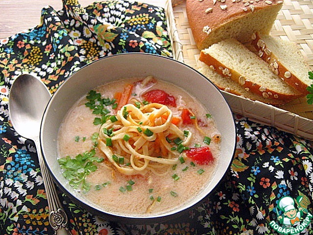Неожиданно сытный ,но легкий суп получился. Лапшу сделала из муки твердых сортов пшеницы, сливки исмягчили кислоту помидор, получилось очень нежно и пикантно.