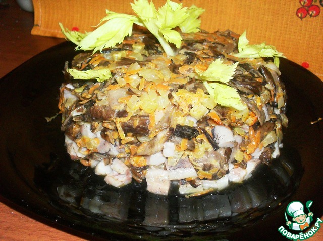 Сразила меня наповал,в первую очередь фотография блюда.Потом,почитав состав,я поняла,что ЭТО я точно буду кушать с удовольствием. Просто мне очень нравится вкус сельдерея, ну а с грибами,вообще в не конкуренции! Плюс наличие селедочки, добавило пикантности этой закуске!