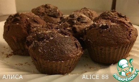 Тесто распределила по силиконовым формочкам без всякой смазки. Получилось 9 штук. Сверху на каждый маффин выложила по несколько кусочков заранее нарезанного шоколада (шоколад плиточный мне кажется вкуснее, чем готовые шоколадные капли). Ну и всё. Отправила в духовку минут на 25, при температуре около 200 градусов.