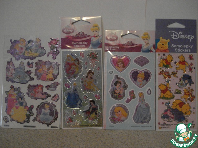 Наклейки с принцессами и Винни-пухом. Кстати, холодильник уже обклеен принцессками