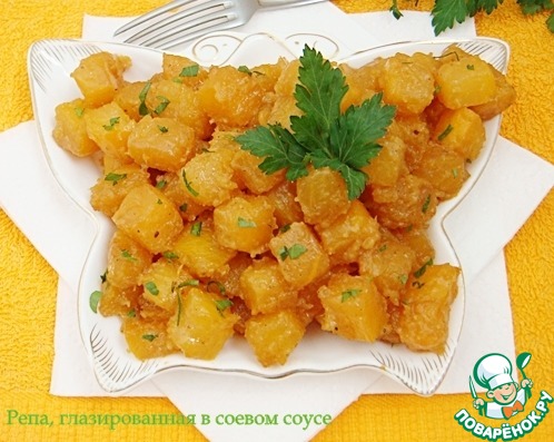 Репа, глазированная в соевом соусе по рецепту Ларисочки larik_malasha, - первое в моей жизни знакомство с репой. Очень пикантное и нежное блюдо! Но вот с репой мне не очень повезло, попался сорт с горчинкой. Буду искать другой и непременно повторю блюдо.