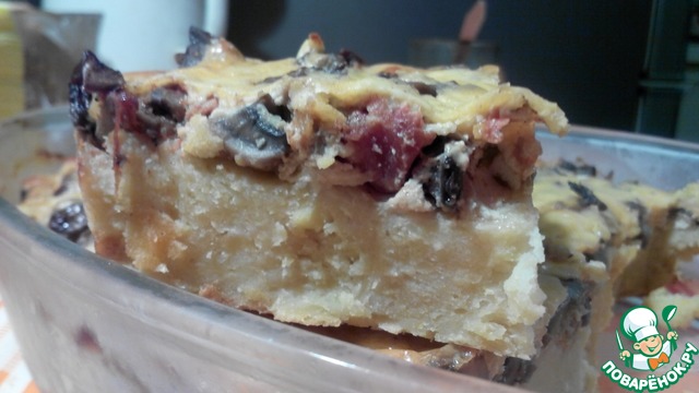 Добавили вишню и малину. Мне очень неудобно это писать, но пирог я даже не пробовала - приготовила поздно вечером, сфотографировала, утром умчалась на работу. А когда вернулась - пробовать было уже нечего. Муж был выходной и приговорил его сам.