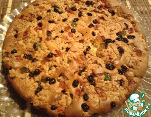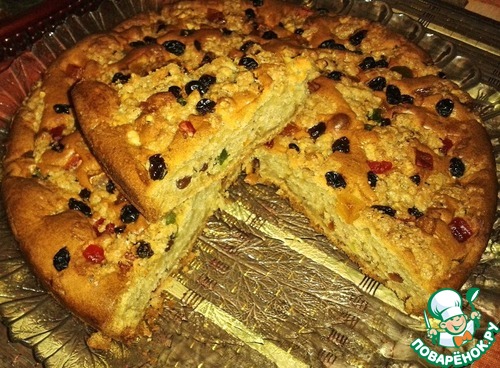 Великолепный и очень вкусный пирог! Прочитав все комментарии, в тесто добавила 100 г сахара. А муки у меня ушло больше, чем написано в рецепте. Для начинки использовала изюм, измельченные грецкие орехи (чуть-чуть), добавила немного цукатов и использовала коричневый сахар.