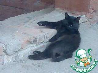 На следующую киску я буквально наткнулась при выходе из магазинчика. В магазине продавали мясо, колбасы и молоко, до сих пор не знаю почему ей удобно было лежать перегораживая половину входной двери (на фото видно как она вольготно развалилась). Может мяском угостили, а может от запахов балдела и снился ей кошачий рай