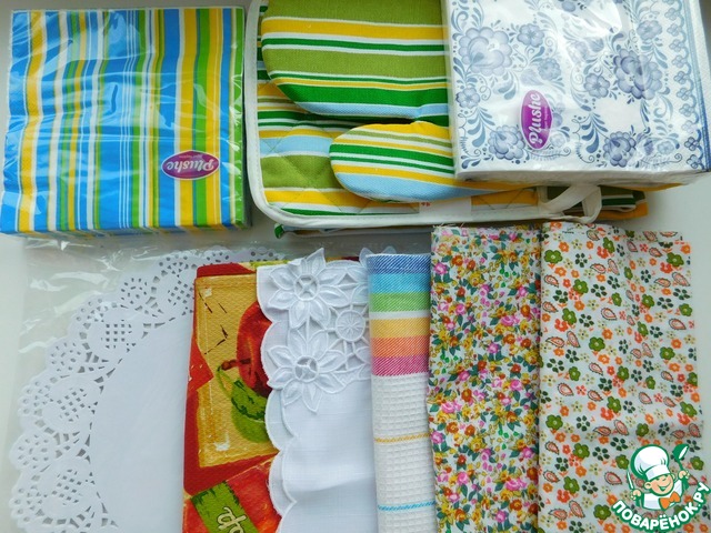 Много-много всяких тряпочек и салфеточек для фуд-фото, прихваточек и даже фартучек! Я теперь самая модная девчонка на кухне!!!!