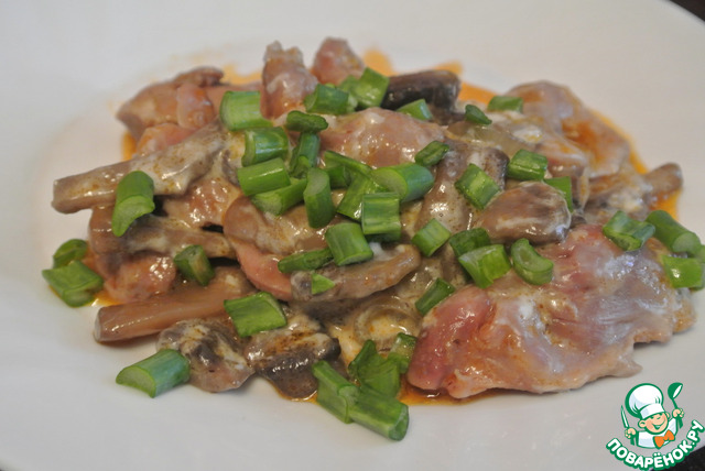 У меня вместо сердечек куриные желудки, которые тушила около часа, а затем после добавления сметаны и уже обжаренных грибов с луком еще около 5 минут. Получилось сочно и очень-очень вкусно.