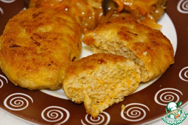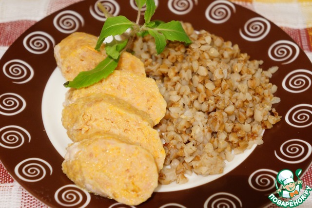 Так как готовила уже вечером и получилось много фарша, а крутить аккуратно и быстро у меня не получалось, я часть этого сосичного фарша пожарила в виде котлет, запанировав в цельнозерновой муке (все готовила строго по рецепту, вместо тыквы - морковь), получились великолепные, просто обалденные котлетки.