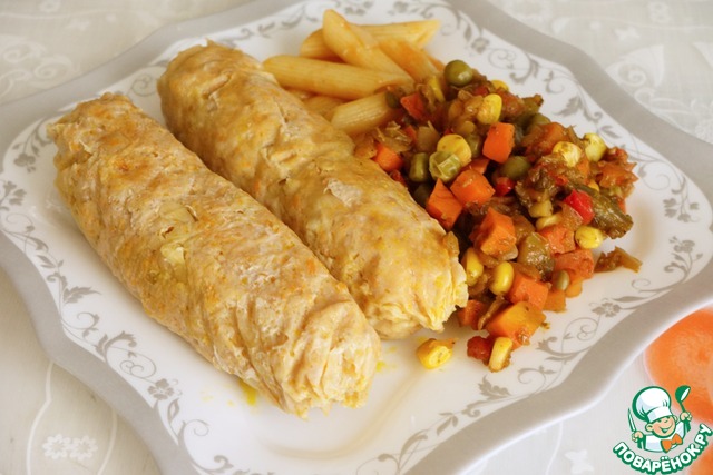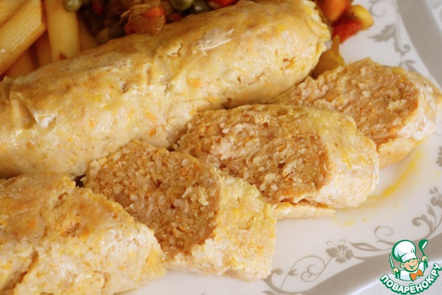 А с другой частью сосисок вот что получилось. Я закрутила их не в пакет для запекания, а в пищевую пленку, планируя готовить их на пару. Положила в холодильник, под морозилку, думала приготовить их через сутки, в морозилку убирать не хотела, а под морозилкой они слегка у меня прихватились, но не замерзли совсем. Через сутки приготовить их не получилось, готовила уже через трое суток, они все это время лежали чуть подмерзшие, в холодильнике под морозилкой. Готовила я их на пару, как и планировала, и получила полнейший восторг, именно эти сосиски оказались самыми сочными и вкусными, это просто фантастически сочно, нежно, вкусно, диетично!!!