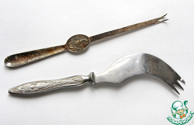 Теперь про твои вилочки. Одна , потоньше, совершенно точно нужна для вынимания мяса из крабов,(там по-моему даже крабик нарисован на ручке) а вторая, предположу, для отскабливания устриц из раковины...