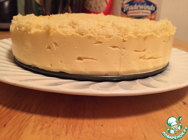 .......Вот и зря! Обычного желатина мне "типа" не хватало (было всего 30 гр.), и я с какого-то перепугу решила добавить имевшийся у меня в наличии апельсиновый (леший попутал!) Всего 10 граммов....а какой эффект! Во-первых, торт приобрел желтоватый оттенок, как видно на фото. Но это пол-беды, а вот суфле вышло плотнее чем я ожидала, хотя и осталось достаточно нежным. Конечно я понимаю, что если бы пропорции были соблюдены в точности, всё вышло бы великолепно! Но, как говорится, не совсем удачный опыт - тоже опыт. Всё равно получилось вкусно! Я конечно буду готовить этот замечательный торт ещё и ещё! Сестра уже попросила приготовить, когда приеду к ним с визитом
