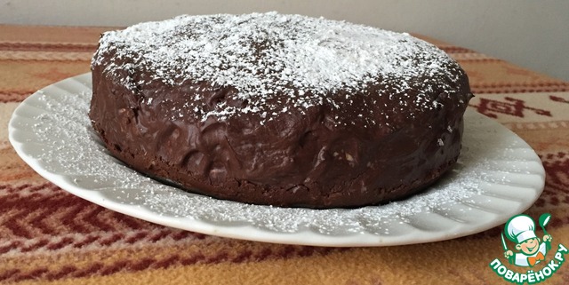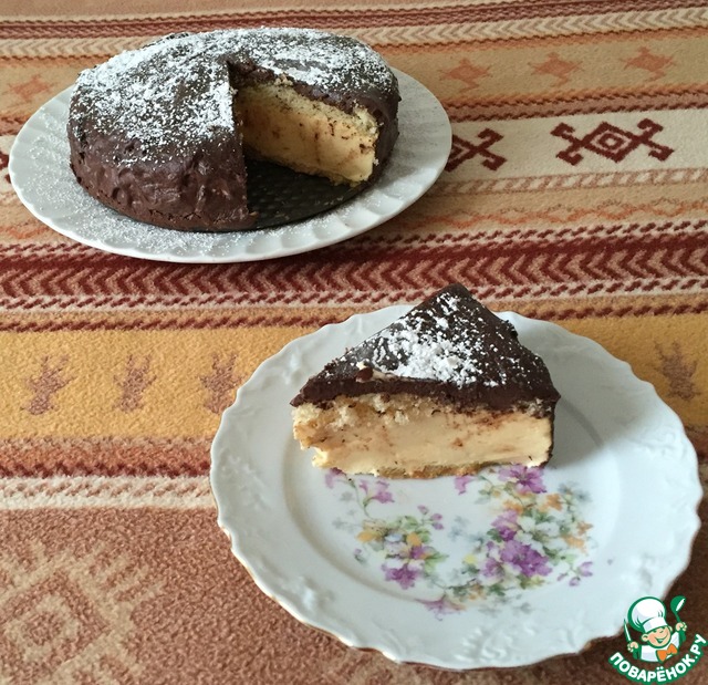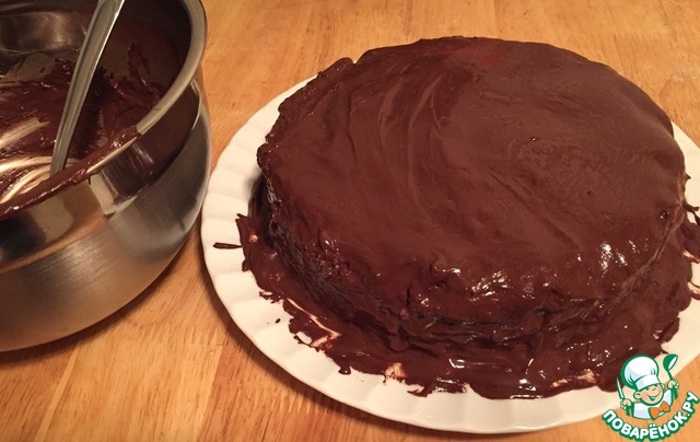 Вот сразу после. Глазурь делала из 100% шоколада для выпечки, несладкий - у нас продаются такие плитки. Он ужасно густой, и ничто не помогало его разбавить, никак не хотел таять на водяной бане! Добавляла молоко - бесполезно! В итоге разбавила водой и еле-еле растопила....Глазури получилось НУ ОЧЕНЬ МНОГО, слишком много для на моей 20-см. формы. Лично для меня это еще лучше, так как люблю толстый-толстый слой шоколада