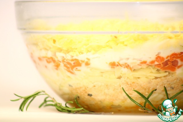 И еще душе захотелось Мимозы, наверное комплектом к цветам )))), с горбушей: Классический салат "Мимоза" от begi https://www.povarenok.ru/recipes/show/32629/. Классика, что еще добавить, вкусно! :