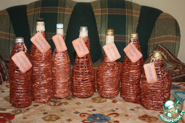 [cut] Слева направо: настойка черносливовая, настойка кедровая, зубровка, яблочное вино, настойка ореховая, калгановка с кофе, крамбамбуля.